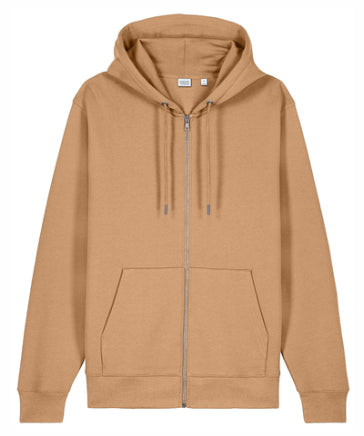 A premium zipped hoodie with a classic look. Organic and recycled fabrics blend beautifully offering cozy warmth with refined details that stand out from the crowd. 10.3-ounce (350-gram) 80% organic combed ring spun cotton/20% recycled polyester brushed 3-end fleece cotton face. Double self-fabric lined hood. Dyed-to-match round drawcords with metal tips. Metal eyelets. Herringbone back neck taping. Self-fabric half moon at back neck. Exposed metal zipper. 1x1 rib knit cuffs and hem. Double-needle topstitch on armholes cuffs and hem seams. Front pouch pockets. 100% recycled polyester tear-away label. Modern medium fit: Designed for a roomier fit opened up across the chest and shoulders.