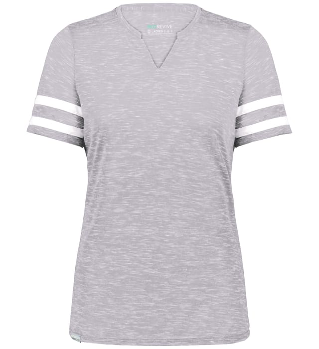 * Eco-Revive?? product featuring 95% recycled polyester/5% cotton * Wicks moisture * Ladies' fit * Tagless label * V-neck collar * Set-in sleeves