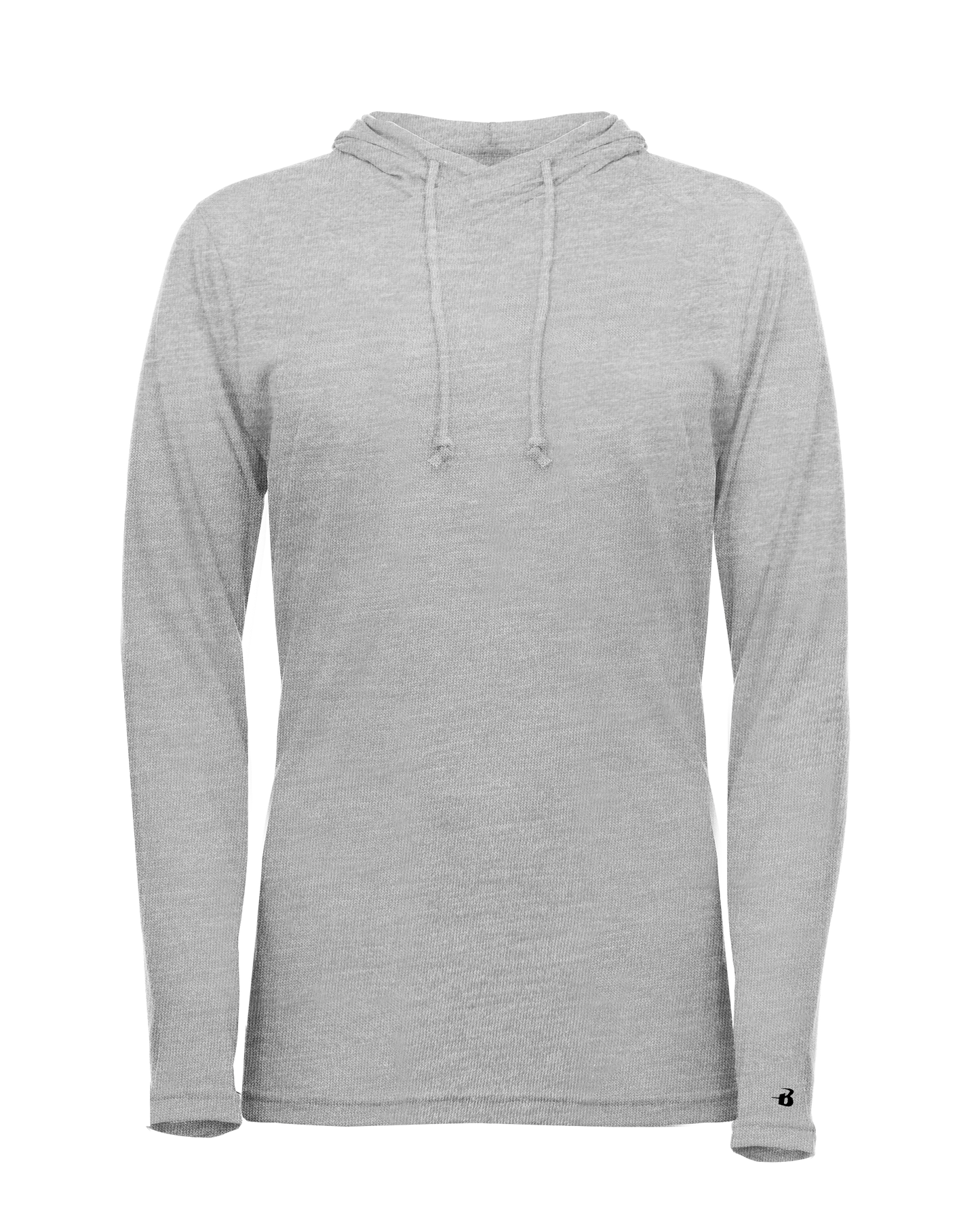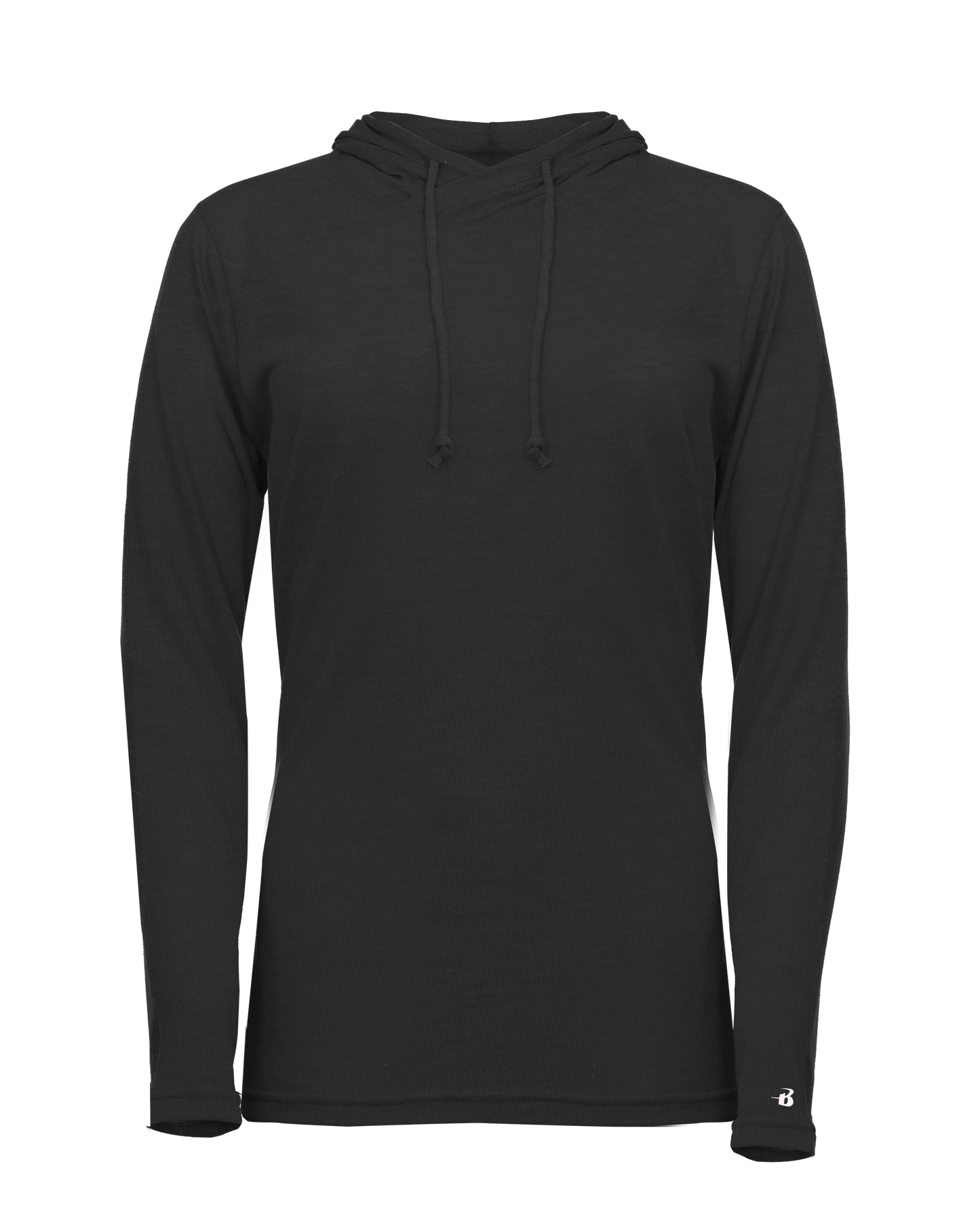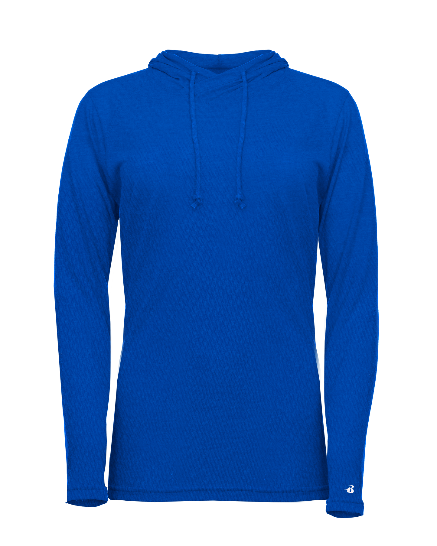 Badger sport shoulder for maximum movement. Self-fabric surplice hood with drawcord. Thumbholes in Sleeves. Double-needle hem. Badger heat seal logo on left sleeve