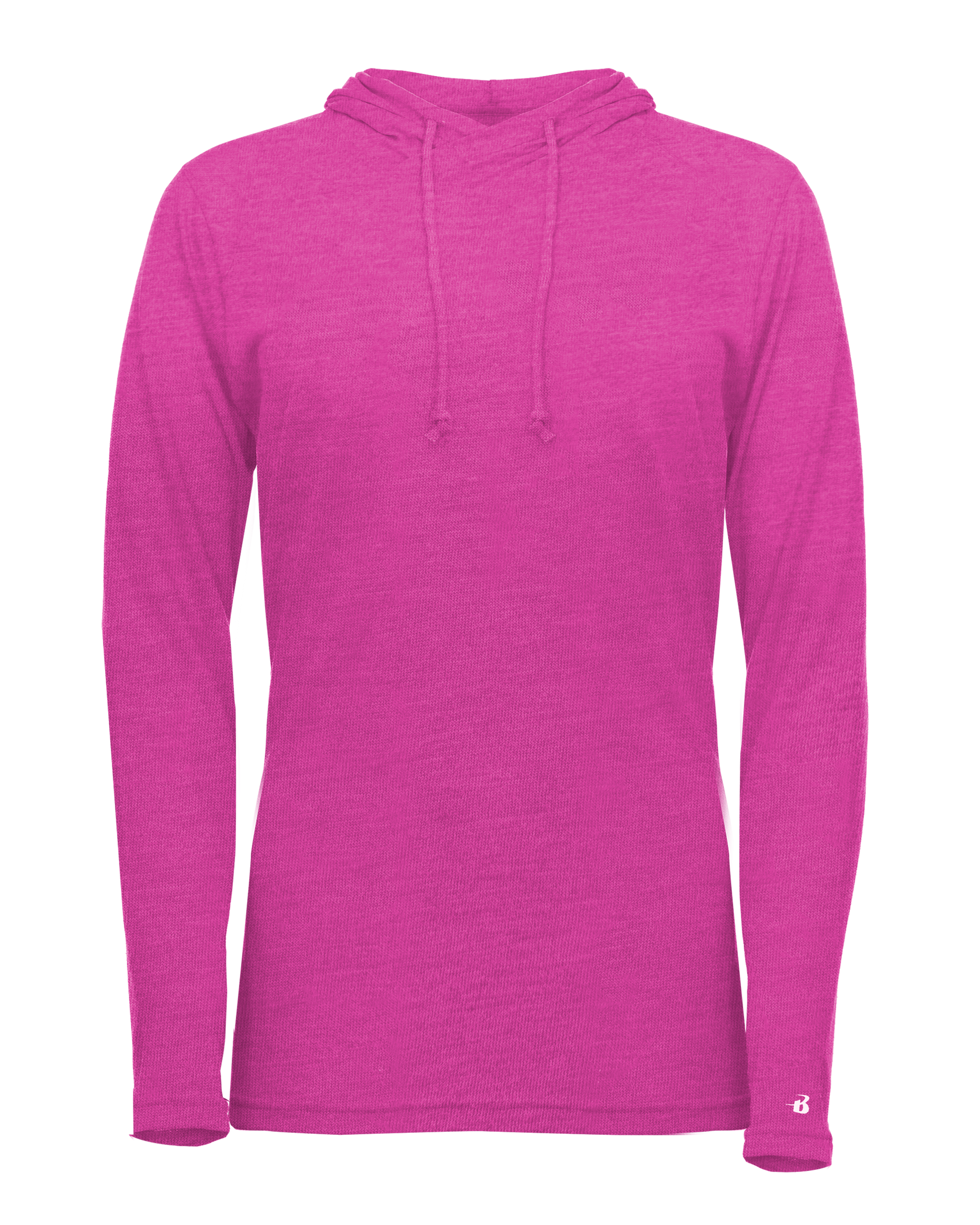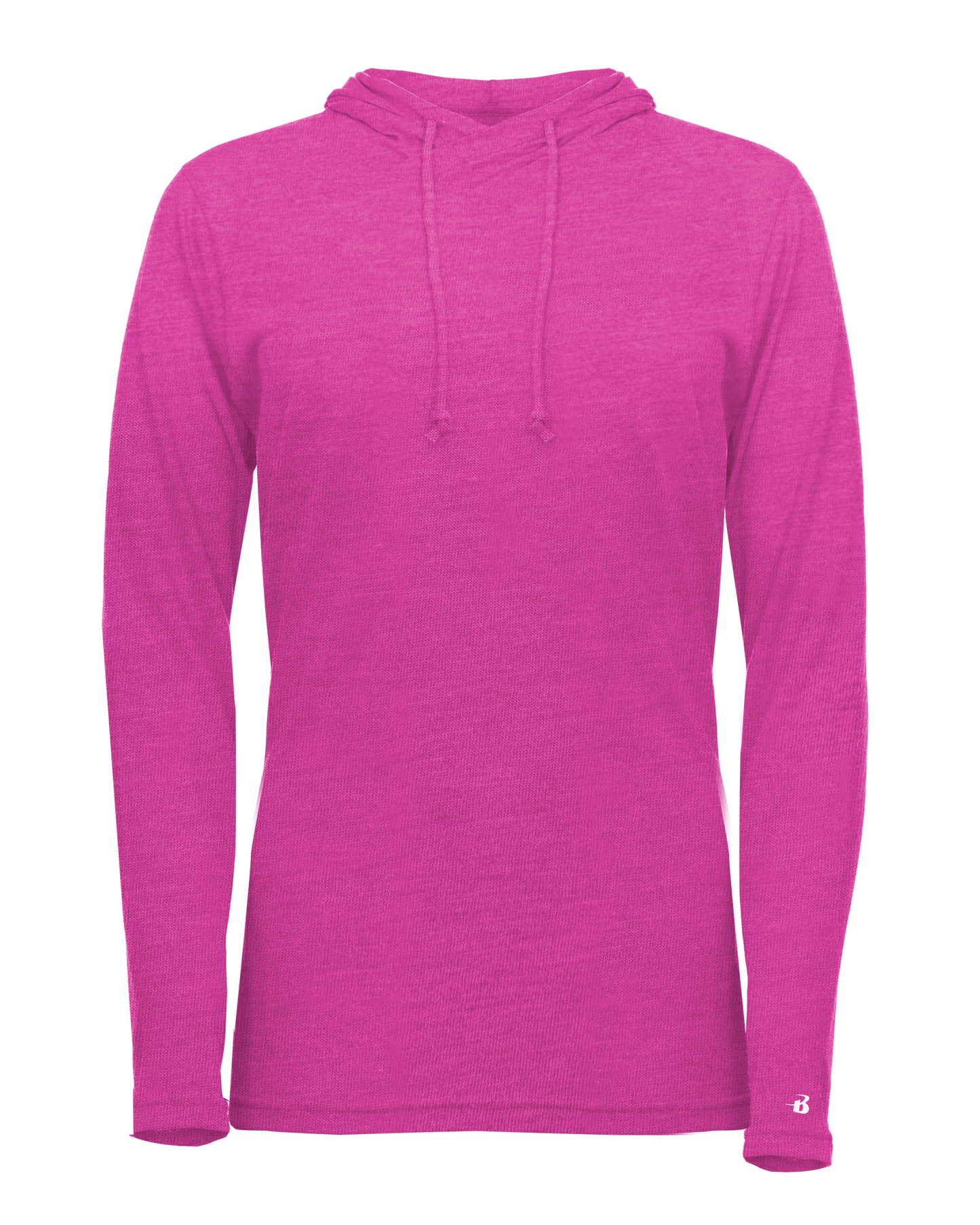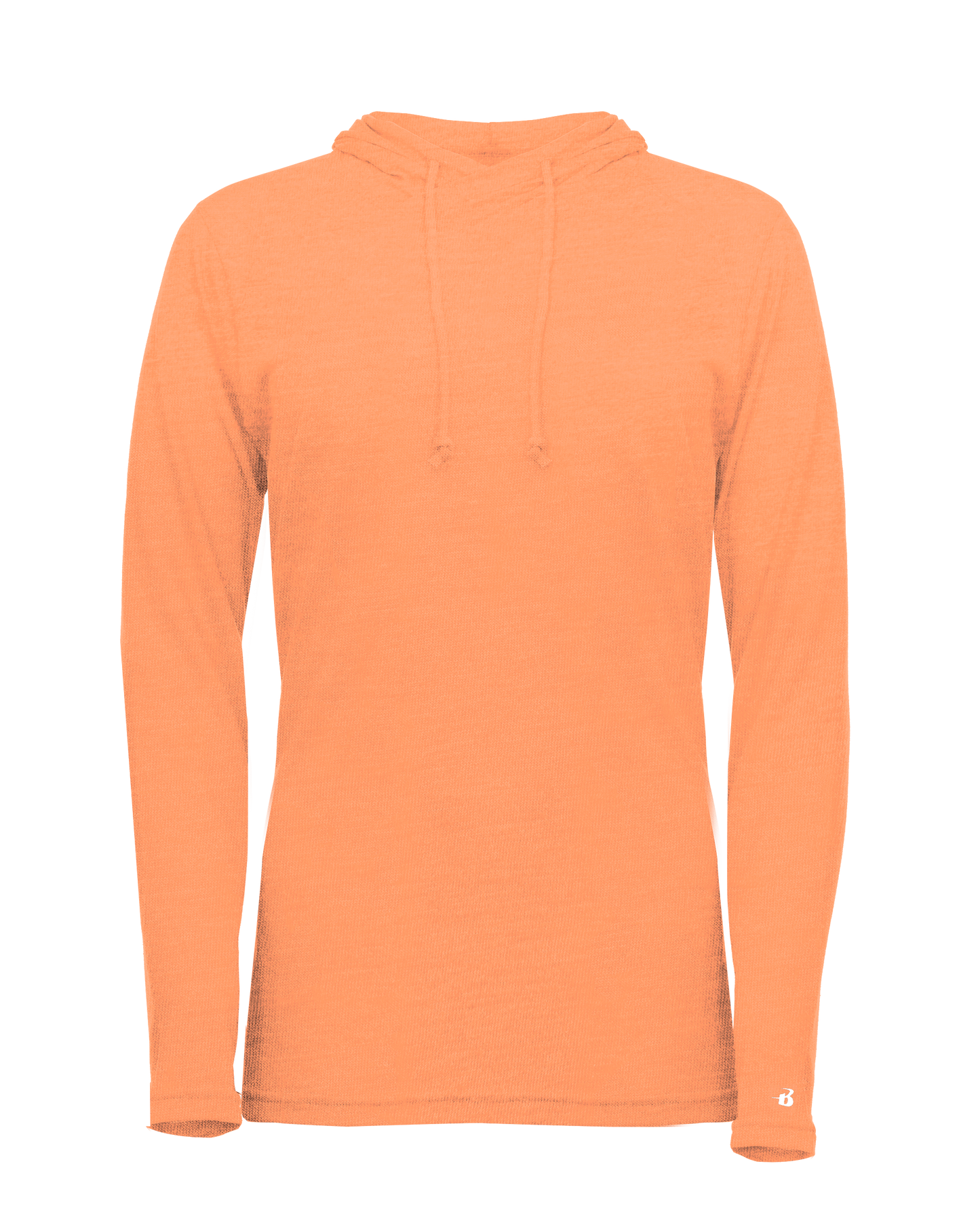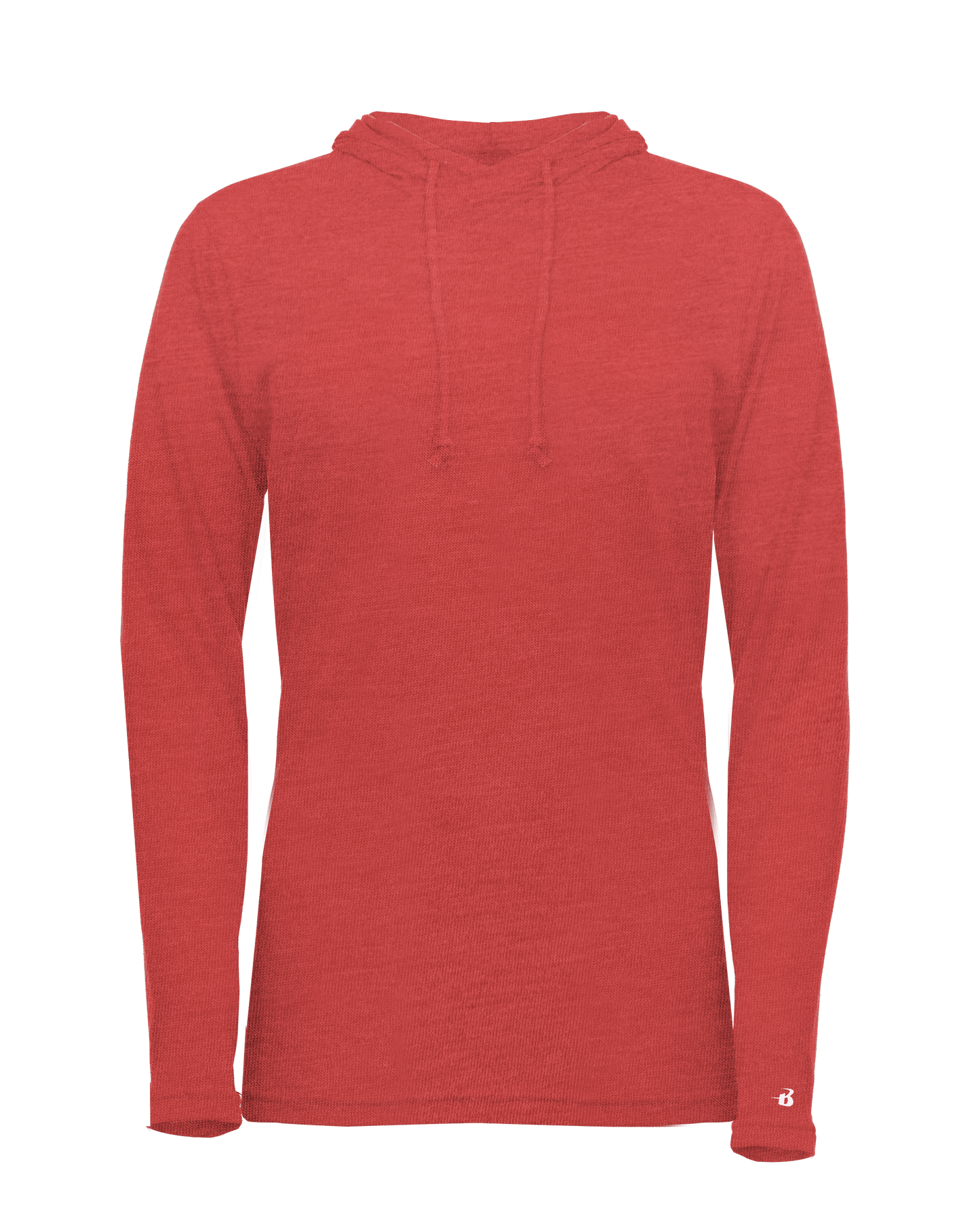 Badger sport shoulder for maximum movement. Self-fabric surplice hood with drawcord. Thumbholes in Sleeves. Double-needle hem. Badger heat seal logo on left sleeve