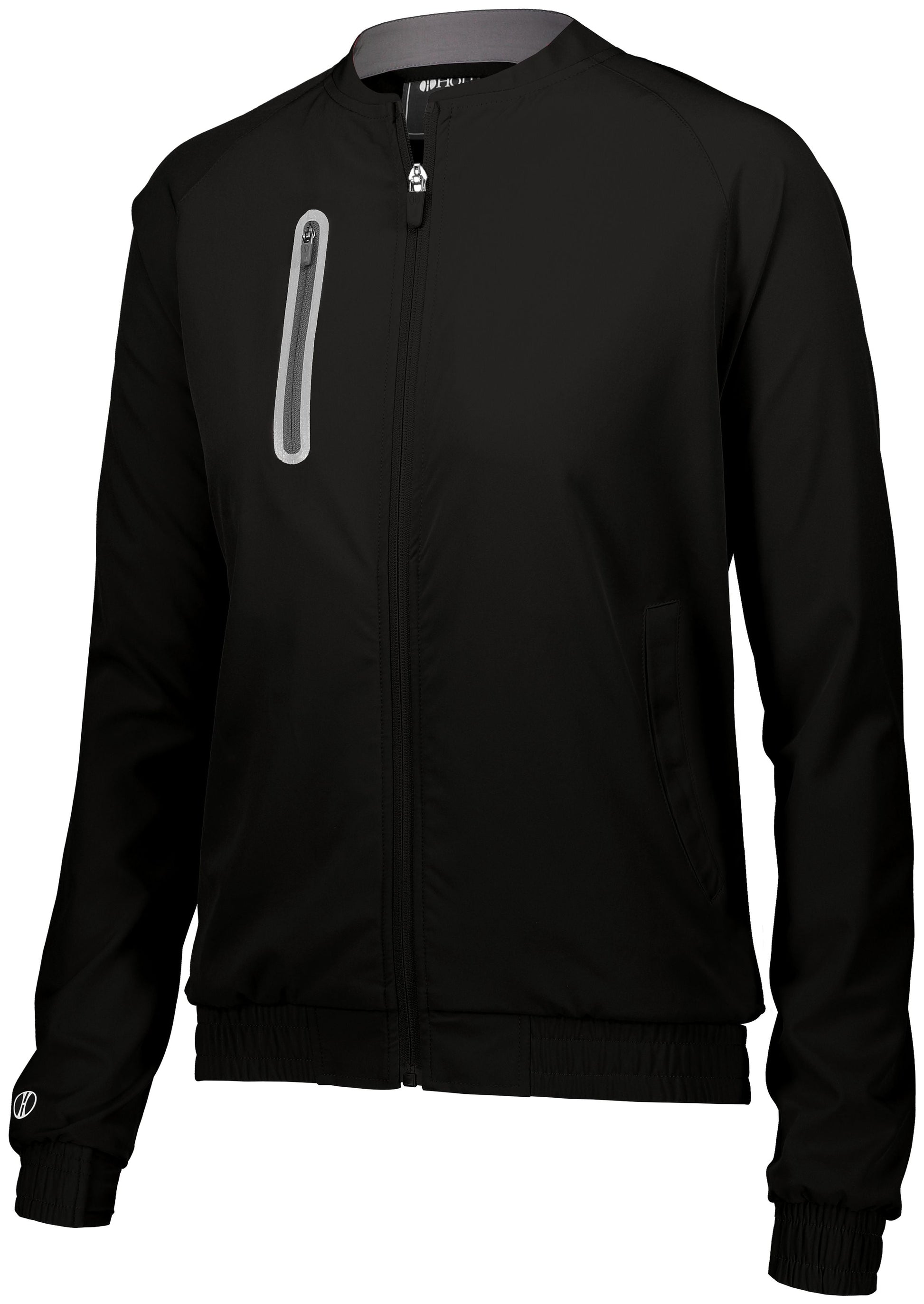 * 90% polyester/10% spandex, 4-way stretch woven fabric * Ladies' fit * Woven label * Front zipper * Low profile collar * Raglan sleeves with thumbholes for warmth * Locking front and dual inside pockets * Zippered valuables chest pocket with reflective metallic silicone welded detailing * Elastic cuffs and bottom * Water-resistant