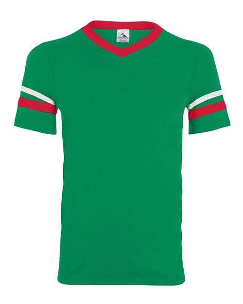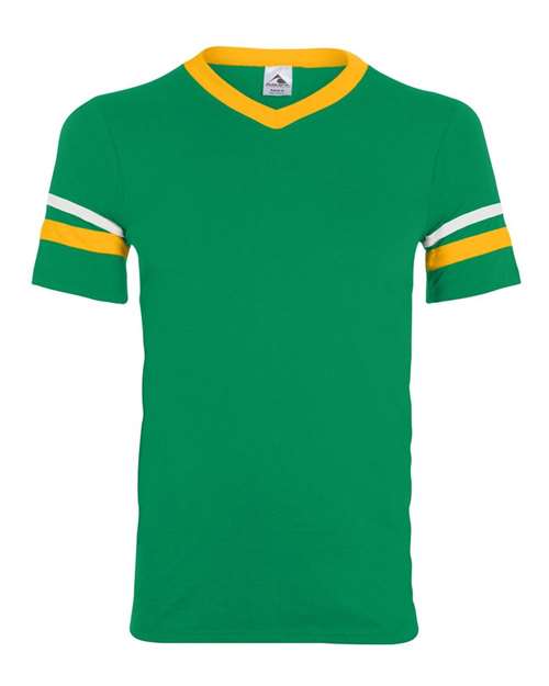 4.8 ounce 50% polyester/50% cotton jersey knit.?ÿ Contrast color V-neck collar.?ÿ Set-in sleeves with contrast color sleeve stripes